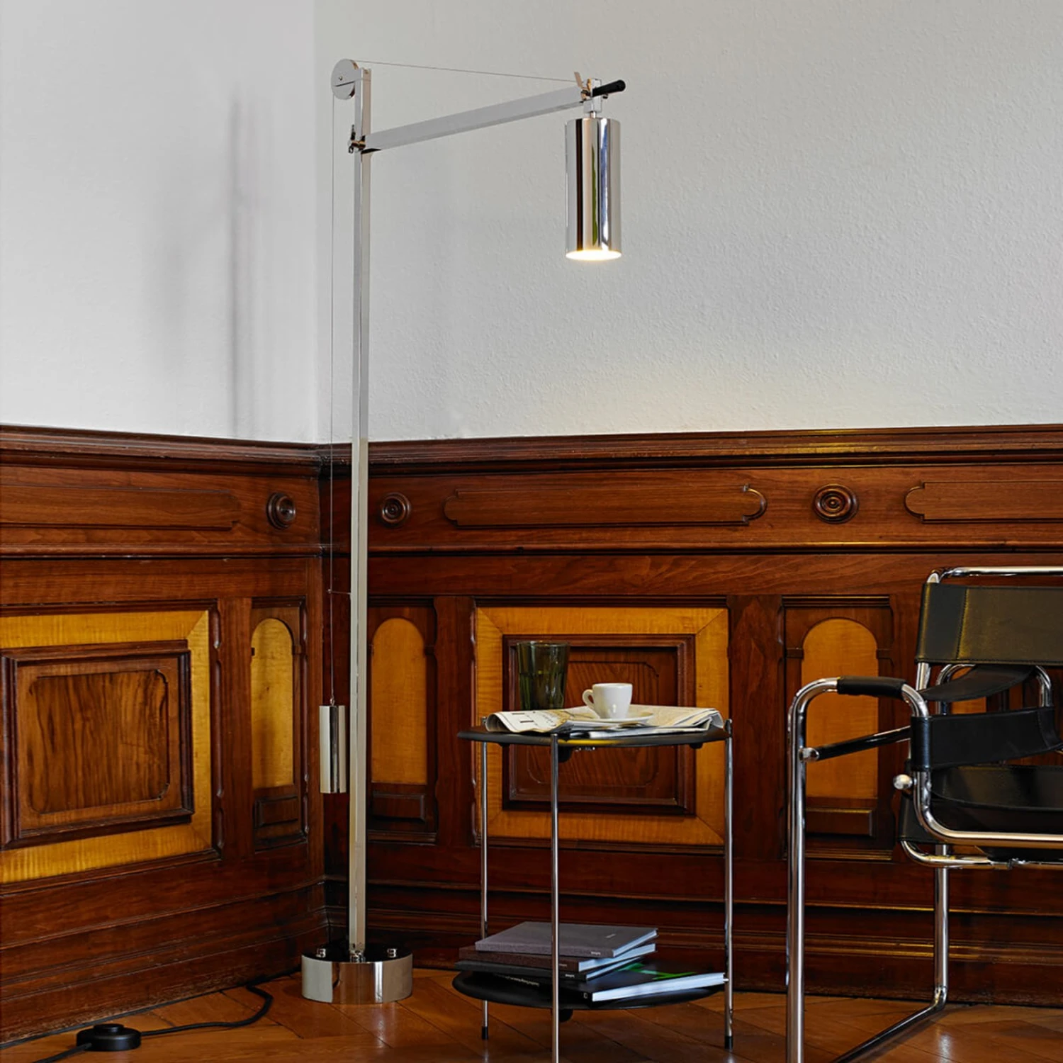 Diese LED-Stehleuchte mit außergewöhnlicher Konstruktion ist nach Vorlagen entstanden, die zu Zeiten des Bauhauses entwickelt worden sind. Es handelt sich um einen originalgetreuen Nachbau. Bemerkenswert ist die Ausführung mit damals typischem Gegengewicht, durch das die Neigung der Leuchte bestimmt wird. Das Material besteht aus vernickeltem Metall. Die Stehleuchte ist durch ihr Design nicht nur Lichtspender, sondern ein imposantes Möbelstück.