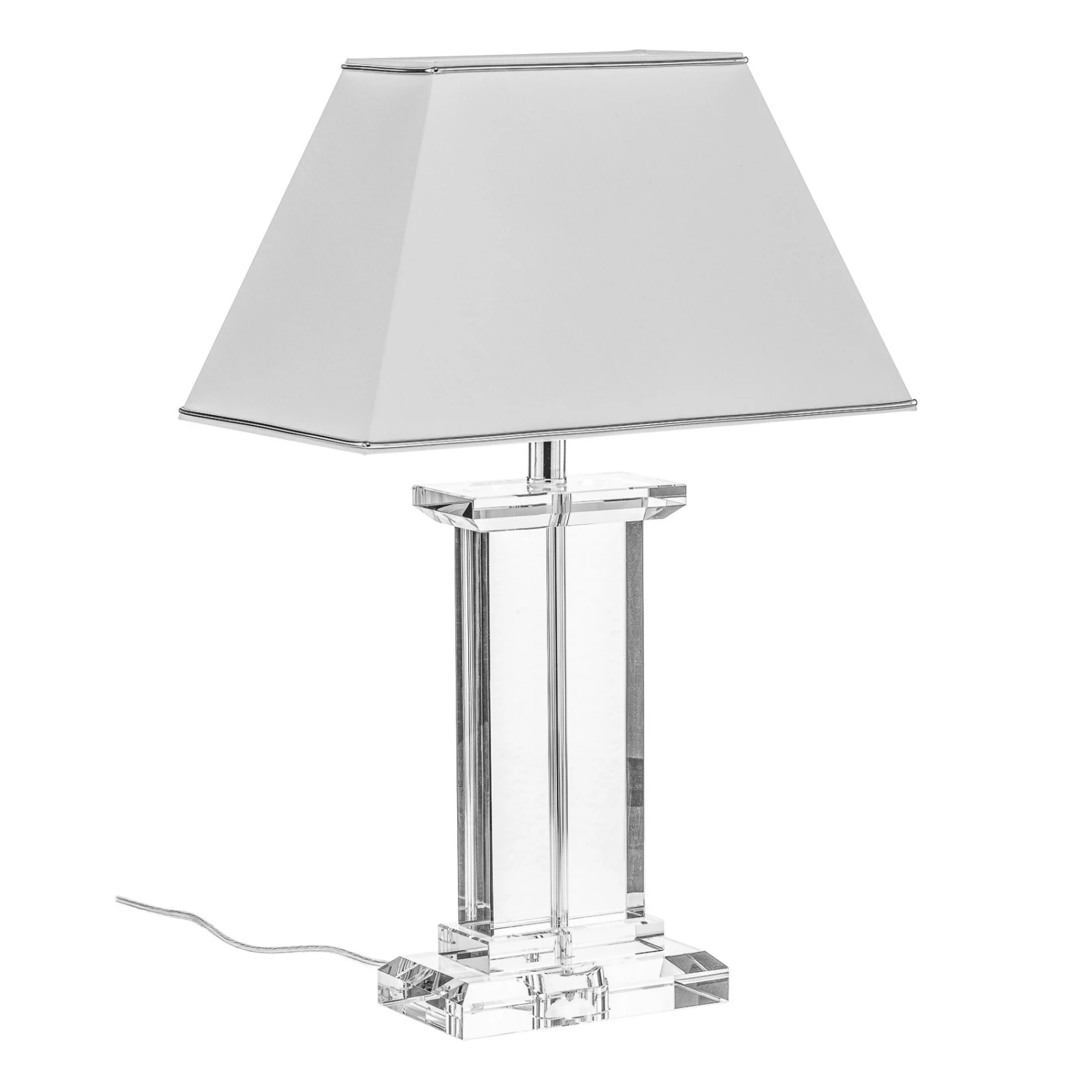 Die weiße Schirmfarbe der Tischleuchte Veronique, kombiniert mit dem breiten, säulenförmigen Sockel, strahlt Ordnung und Struktur aus. Beim Blick auf die Form wird unmittelbar klar: Weder rund noch verspielt gehört zur Welt der Tischleuchte Veronique. Nicht nur der feine Schirm, sondern vielmehr der Fuß aus geschliffenem K9Kristallglas lassen die Eigenschaften luxuriös und prunkvoll durchaus passend erscheinen. Dieser Effekt wird durch das Einschalten der Leuchte noch verstärkt, da die gläserne Säule zusätzlich leicht mit erstrahlt und dadurch einen außergewöhnlich schönen Lichteffekt hervorruft. Trotz der außerordentlichen Merkmale sind die Farben eher neutral gehalten, wodurch die Leuchte in fast jeden Einrichtungsstil hineinpasst. Mit einem warmweißen Leuchtmittel ist sie perfekt als Zusatzbeleuchtung in den verschiedenen Wohnräumen geeignet.