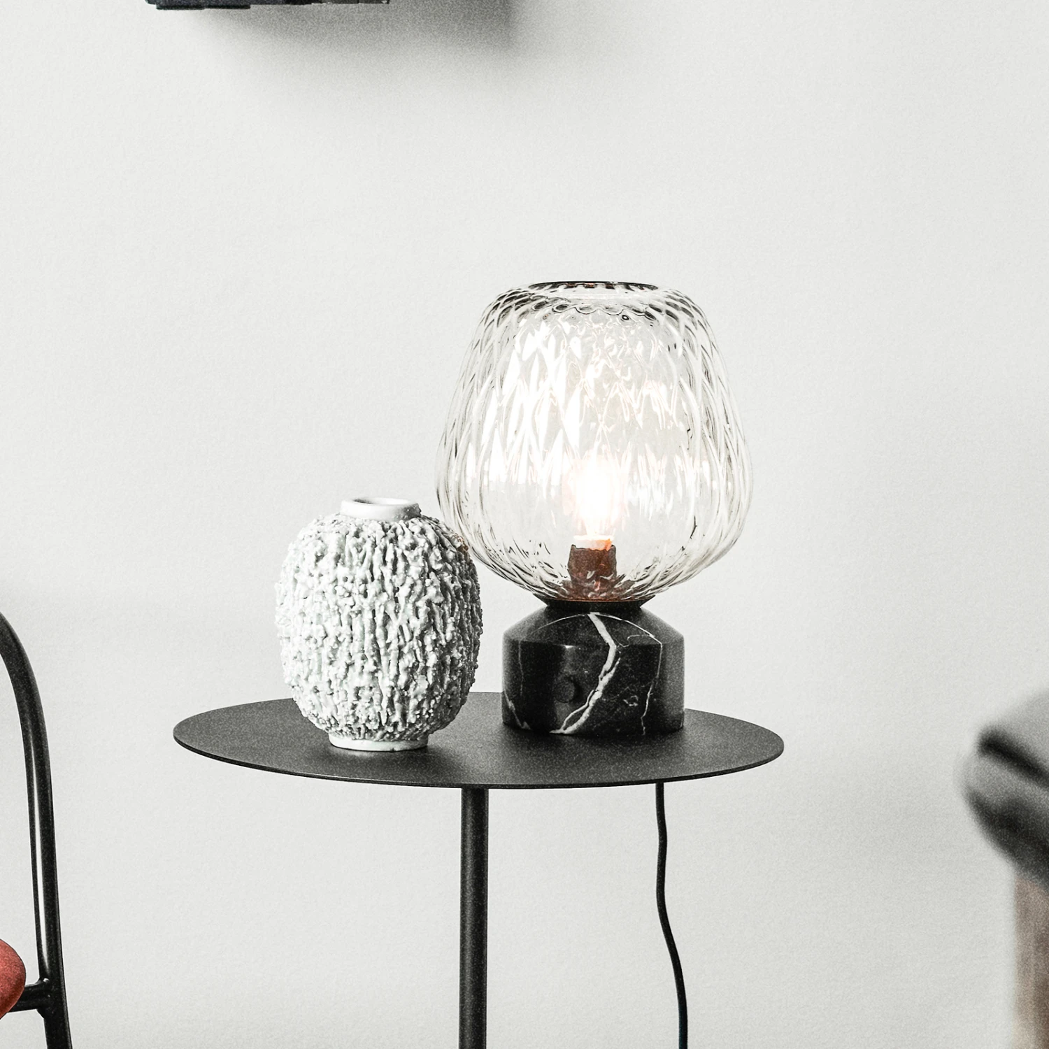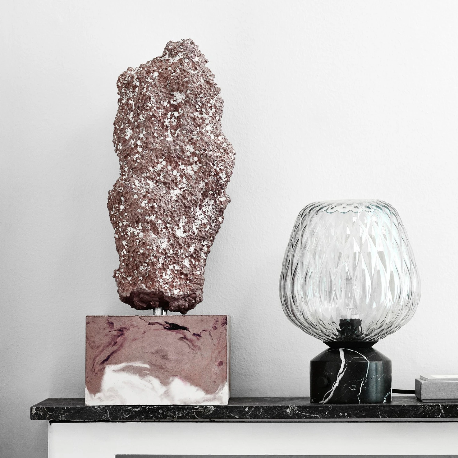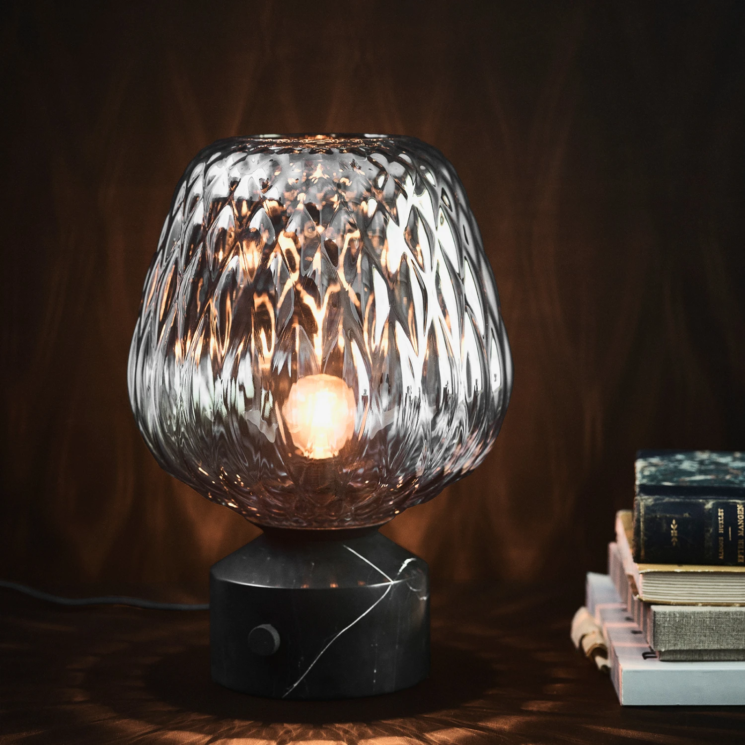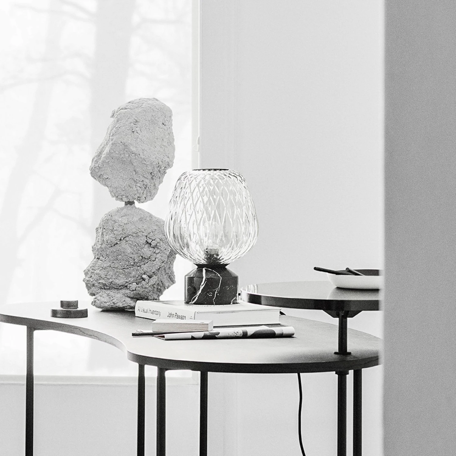 Die Tischlampe Blown SW6 setzt Designer-Akzente innerhalb der Inneneinrichtung und sieht auf Tischen und Kommoden besonders gut aus. Sie besitzt einen aus schwarzem Marmor gefertigten Standfuß, auf dem ein Leuchtenschirm sitzt, welcher aus klarem, leicht silbrig glänzendem, mundgeblasenem Glas besteht. Die Tischleuchte wurde von Samuel Wilkinson kreiert – er recherchierte Glas von Leuchttürmen bis hin zu verspiegelten Flaschen und ließ sich für die Form des Schirmes von Himbeeren inspirieren.