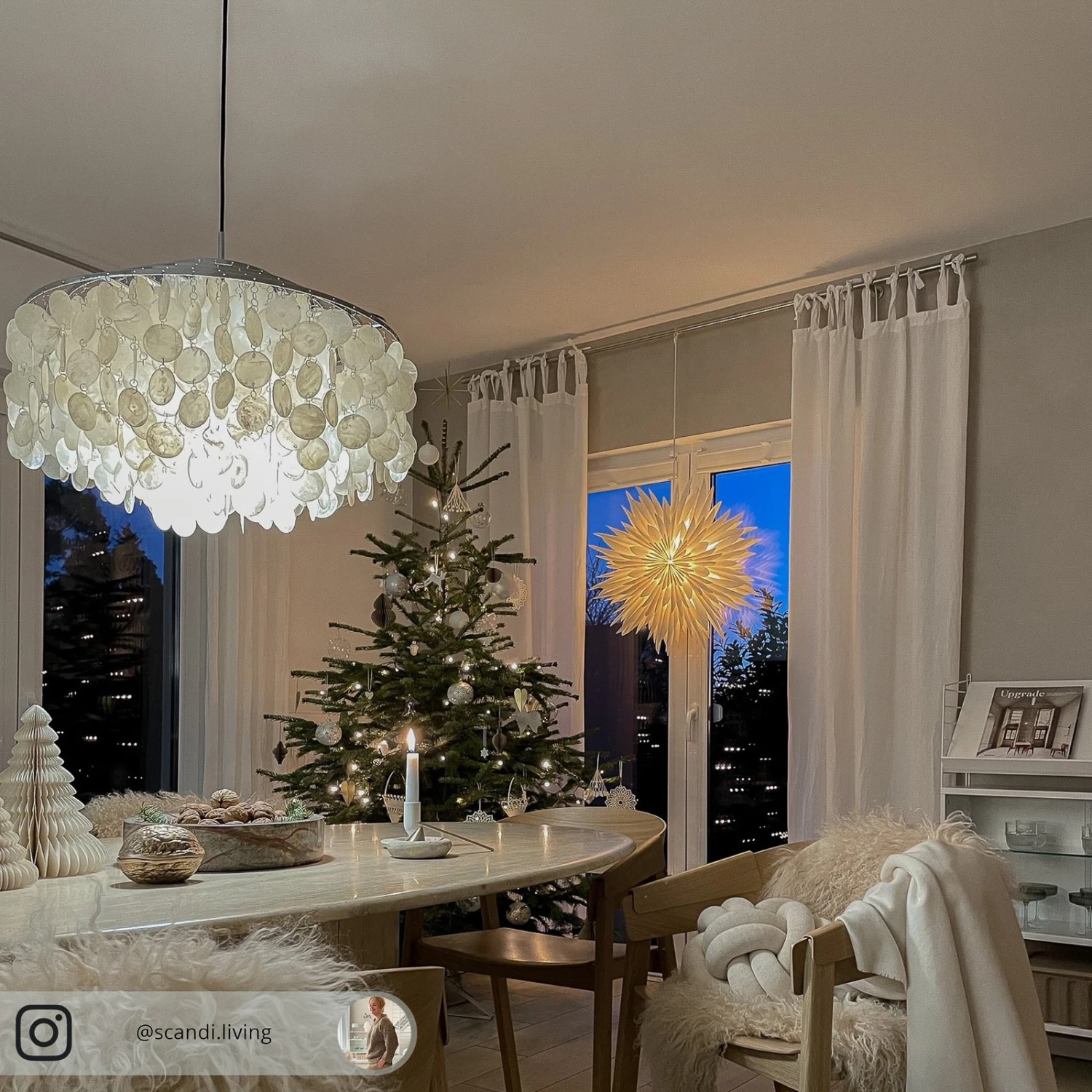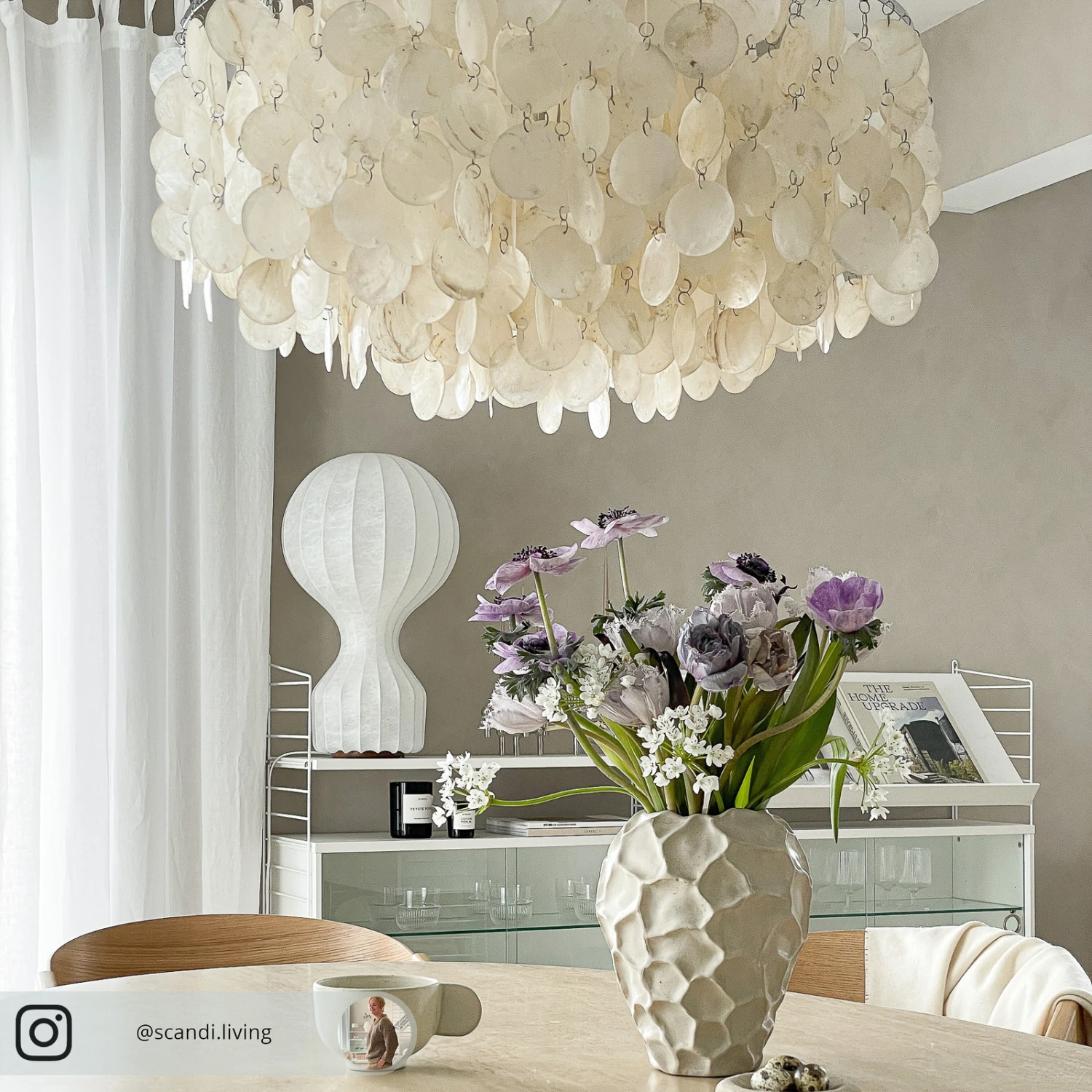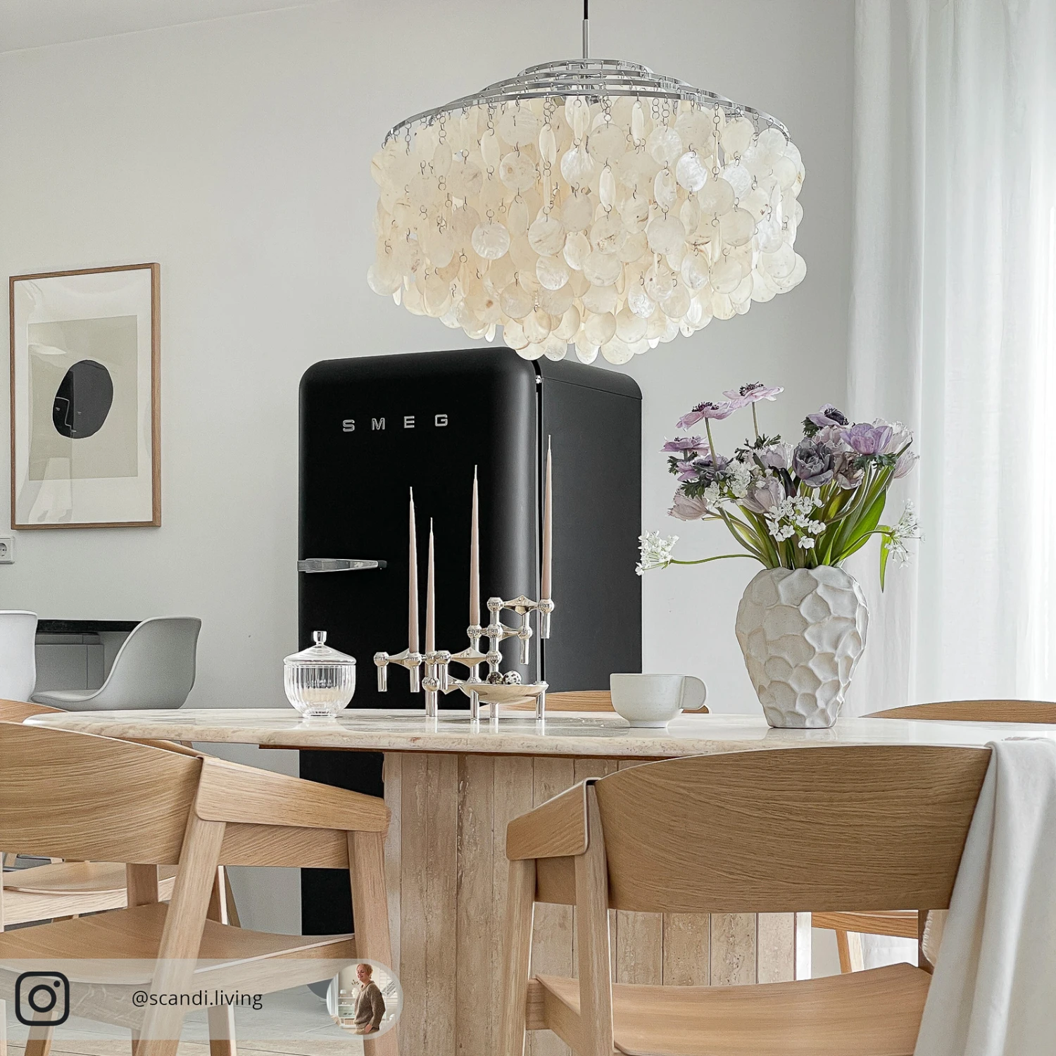 Das Markenzeichen der Leuchtenserie Fun von VERPAN sind die schillernden Ketten aus Perlmutt-Scheiben, die kaskadenartig in unterschiedlichen Längen von den Metallringen herabhängen. Vier Metallringe sind es bei der Hängeleuchte Fun 10DM, die die Basis dieses Designerstücks bilden und den unzähligen, über kleine Edelstahlringe miteinander verknüpften Muschelscheiben den nötigen Raum geben. Faszinierende Farbnuancen und das Spiel der changierenden Perlmutt-Oberflächen mit dem Lichtschein lenken die Aufmerksamkeit des Betrachters spätestens bei eingeschaltetem Licht auf die Fun 10DM. Und warum diese Hängeleuchte nicht nur in optischer, sondern auch in akustischer Hinsicht ein echtes Schmuckstück ist, wird klar, wenn ein kleiner Windzug die Muschelketten streift. Einem Windspiel gleich erfüllen dann die harmonischen, leisen Klänge der sich sanft bewegenden Muschelplättchen den Raum.