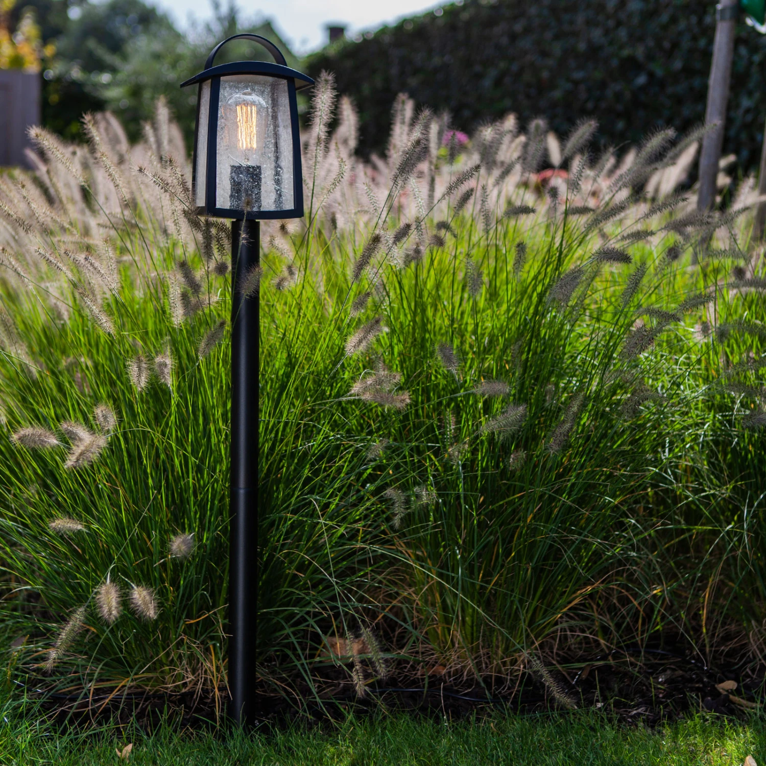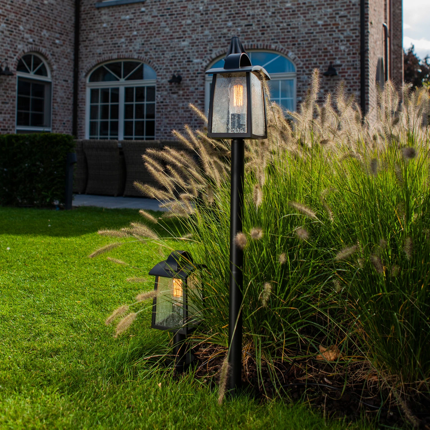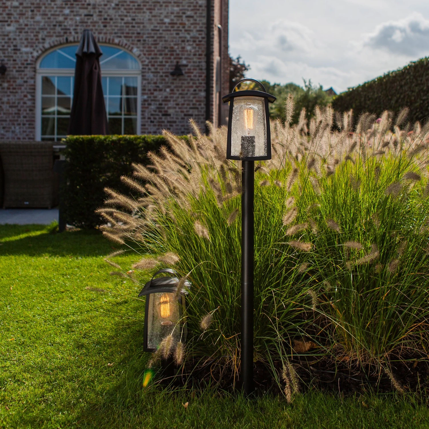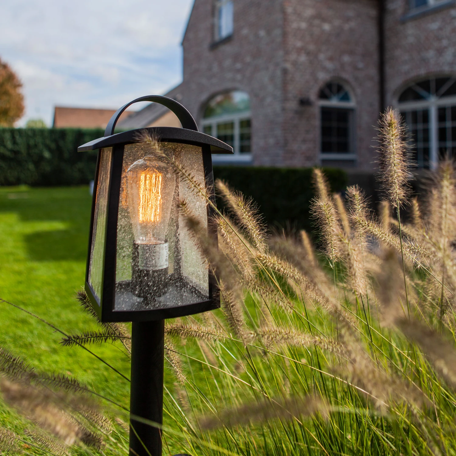 Die Laterne der Wegeleuchte Kelsey thront auf dem schlichten Gestell und kommt dadurch hervorragend zur Geltung. Sie wurde sehr einfach und schlicht gestaltet und ringsum mit klaren Scheiben aus Kunststoff bestückt, die mit einem sehr schönen Tropfendekor begeistern. Durch das klare Material strahlt das Licht hell in alle Richtungen, so dass ein weiter Bereich um die Wegeleuchte erhellt wird. Die schöne Optik wird komplettiert, indem ein Leuchtmittel in Filament-Optik eingesetzt wird. Diese LED-Lampen sehen nicht nur gut aus, sondern sind um ein Vielfaches langlebiger als herkömmliche Glühlampen und benötigen nur wenig Energie.