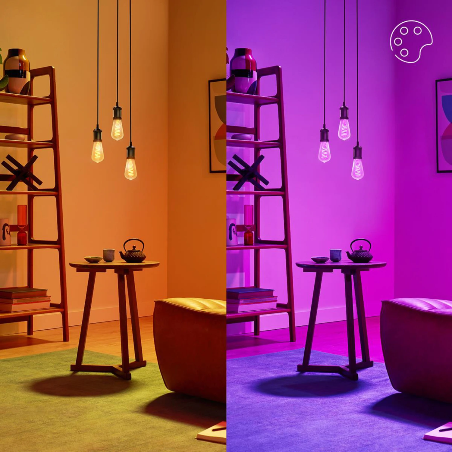 Gerade herkömmliche Leuchten, die einen Blick auf die Fassung gewähren, lassen sich mit dieser LED-Lampe optisch ansprechend smart aufrüsten. Das Leuchtmittel in klarer Rustikaform ST64 ist mit LED-Filamenten ausgestattet, die warmweißes bis tageslichtweißes Licht und dazu zahllose bunte Abstufungen bei dimmbarer Helligkeit ermöglichen. Diese können frei nach Wunsch abgestimmt oder in Form vorkonfigurierter Szenen ausgewählt werden. Alle Einstellungen lassen sich per App auf dem Tablet/Smartphone vornehmen, zudem bestehen Optionen zur Steuerung per Fernbedienung, Sprachbefehl und Smart Home Systeme.